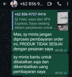 Seller penipu atasnama GOSTORE yang berlokasi di Jakarta Utara dengan nomor telepon 083857263796 melalui jasa pengiriman/ekspedisi SPX telah melakukan penipuan secara sistematis, dimana pihak kurir SPX yang didaulat sebagai penampung uang penjualan produk para seller/penjual penipu ini secara terang benderang tidak mengindahkan komplain/keluhan dari customer/pembeli untuk membatalkan pesanan yang tidak sesuai dengan yang dipesan, bahkan secara terang-terangan pihak kurir mengabaikan komunikasi dari customer dan melimpahkan persoalan ini kepada seller penipu yang jelas sulit dihubungi maupun merespon keluhan dari pembeli.