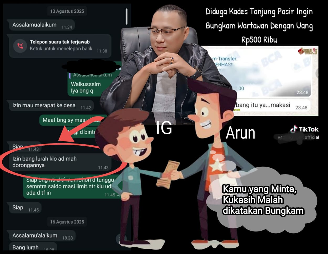 Noven Saputera,S.H. Kuasa Hukum dari Arun,S.Ip menanggapi dan meluruskan yang dikatakan oleh Saudara Igor di dalam narasi tersebut yang dikatakan bahwa binggung tiba-tiba Kades Tanjung Pasir transfer uang Rp.500.000,- (Lima Ratus Ribu Rupiah) yang ditransfer Ke rekening BCA atas nama MAAT IGOR SUDRAJAT dengan Nomor Rekening : 729*****92, pertama-tama kita sampaikan bahwa Saudara Igor diduga tidak melampirkan secara keseluruhan terhadap isi chat WhatsAPP yang di Screen shot dan hanya sepotong bagian Foto pengiriman Bukti Transfer dan tanggapan saudara seolah-olah binggung dan akan mengembalikan, namun kita luruskan bahwa jumlah nominal sebesar Rp.500.000,- yang ditransfer oleh Kades Tanjung Pasir atas permintaan Saudara Igor dimana pada tanggal 13 Agustus 2025 sekitar pukul 11.43 WIB dengan bahasa “IZIN BANG LURAH KLO AD MAH DORONGANNYA” dan Klien kami pun mengiyakan dan mohon waktu karena saaat itu sedang diluar, jadi kesimpulannya Uang atas nominal tersebut itu diberikan atas permintaan saudara Igor dan Klien kami berikan bentuk support dan menghargai profesi wartawan dan itupun bukan sekali ini saja Klien kami ada memberikan sejumlah uang baik Via Transfer dan Cash kalau Sudara Igor berkunjung ke Kantor Desa, dibuktikan “TIDAK MUNGKIN KLIEN KAMI MENGETAHUI NOMOR REKENING SAUDARA IGOR JIKA SAUDARA TIDAK PERNAH MEMBERIKAN ATAUPUN BELUM PERNAH MELAKUKAN TRANSFER SEBELUMNYA” , jadi bukan suatu bentuk pembungkaman awak media yang dimaksud.